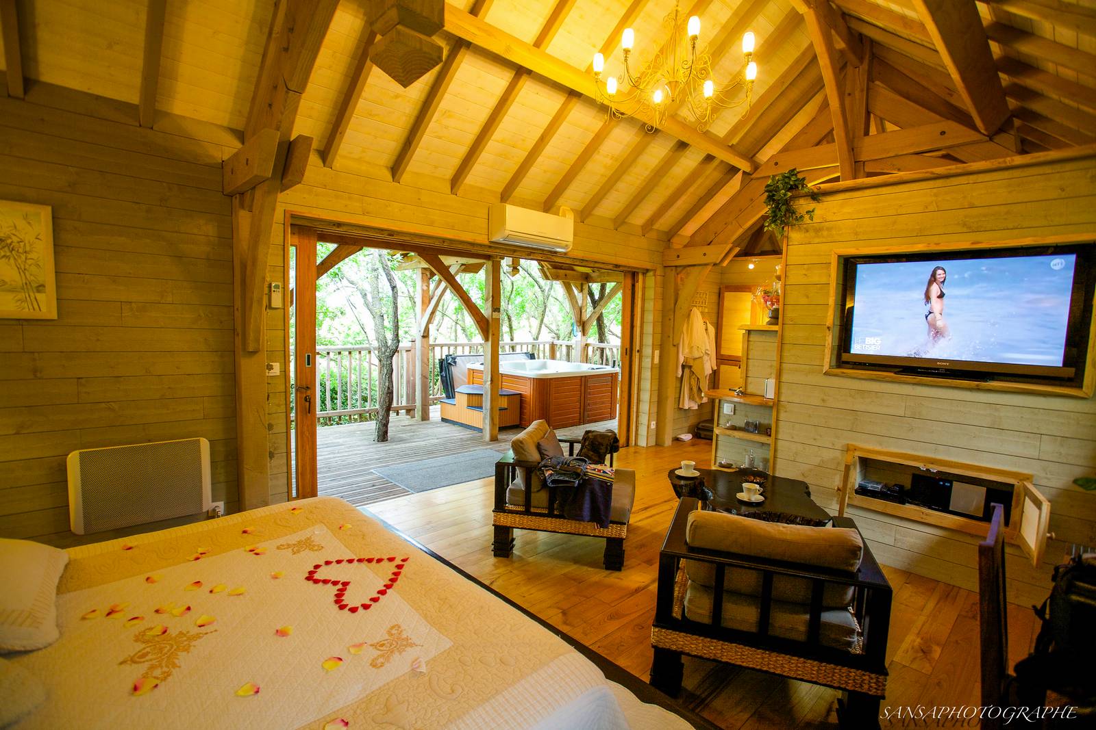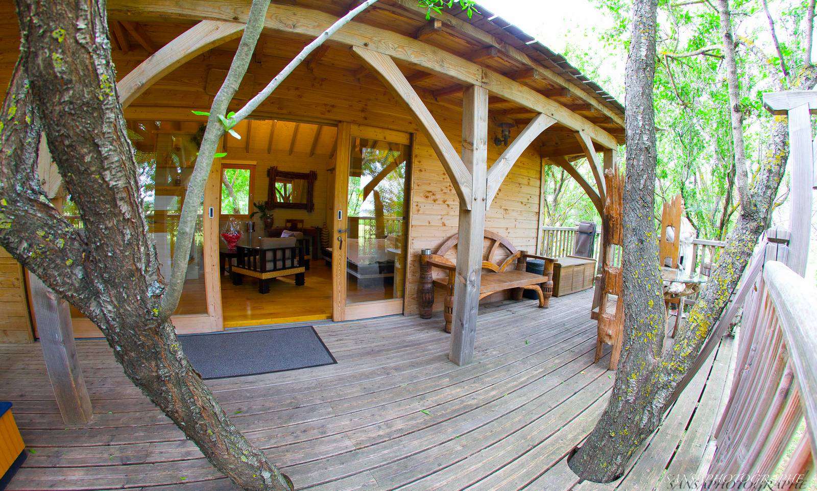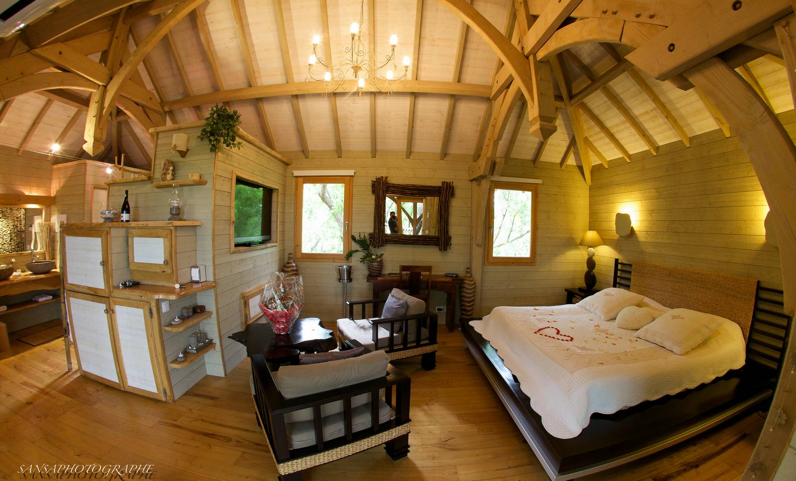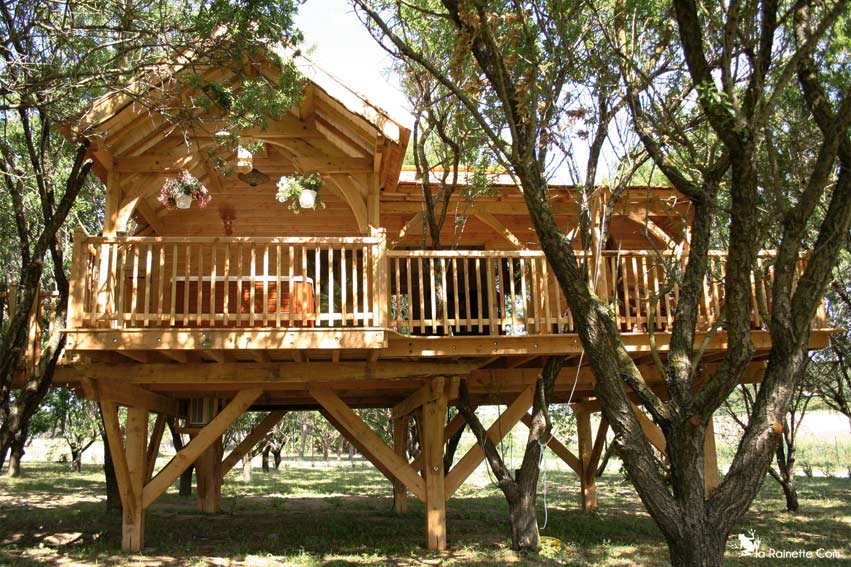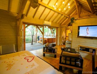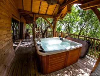 Amongst the almond branches, you will approach your treehouse hideaway via a 30 m long wooden footbridge, beautifully lit at night. Set on stilts, 3 m up in the air, it has a bay window that will offer you varied and exceptional views! On the spacious terrace, sunny in both summer and winter, you will appreciate the heated Jacuzzi spa bath surrounded by the music of cicadas.